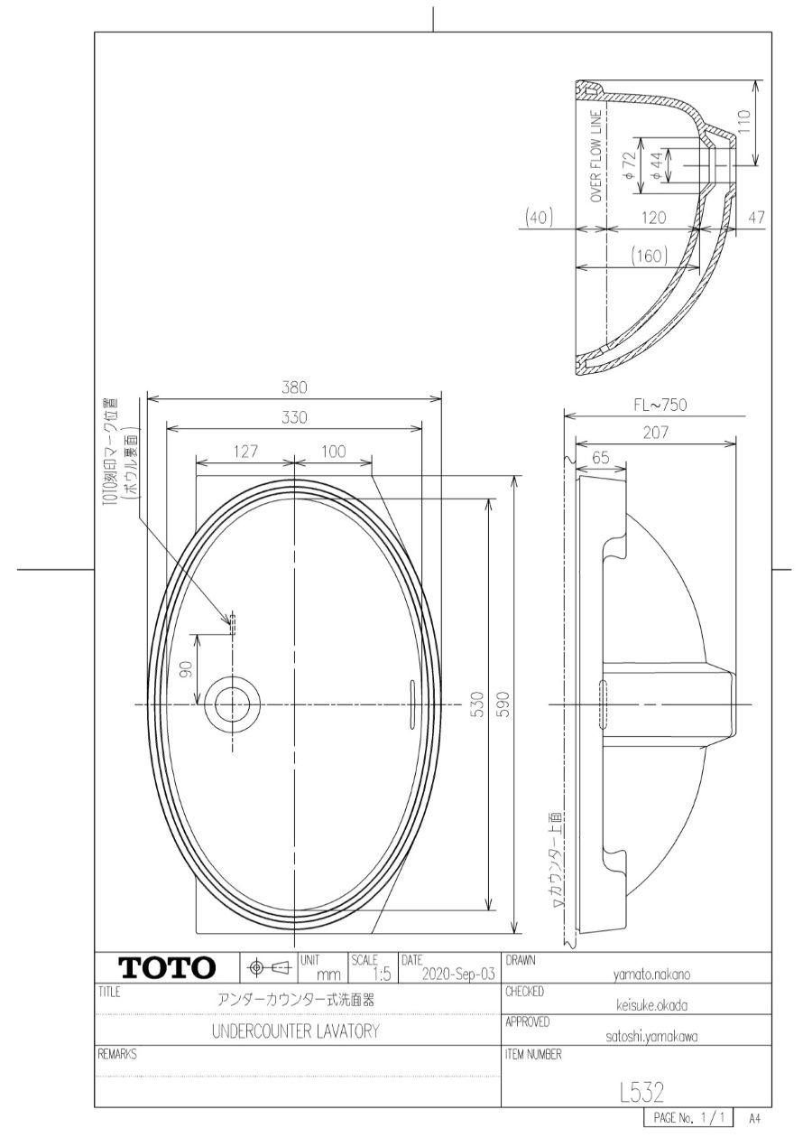 Thông số kỹ thuật của Chậu lavabo âm bàn Toto L532